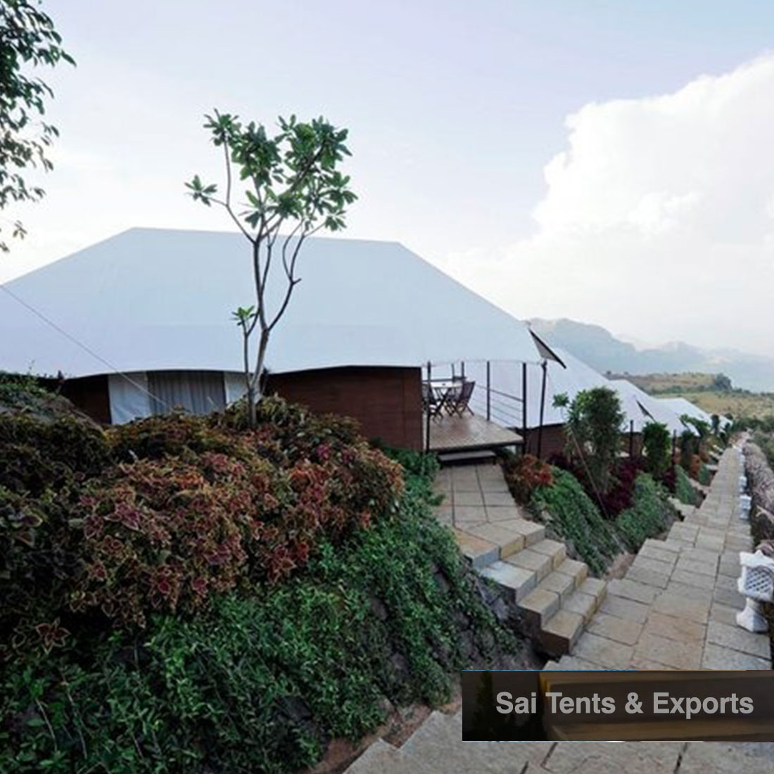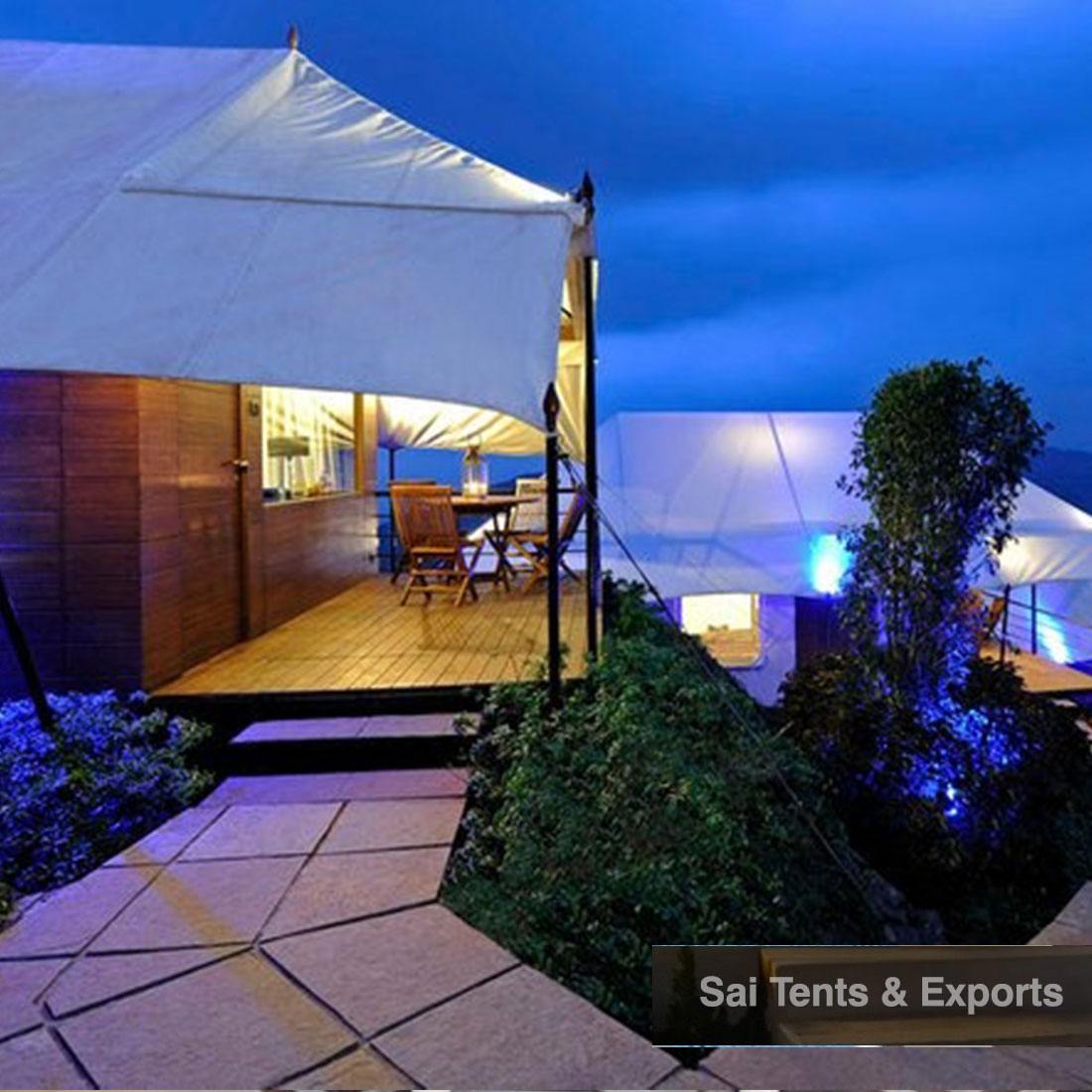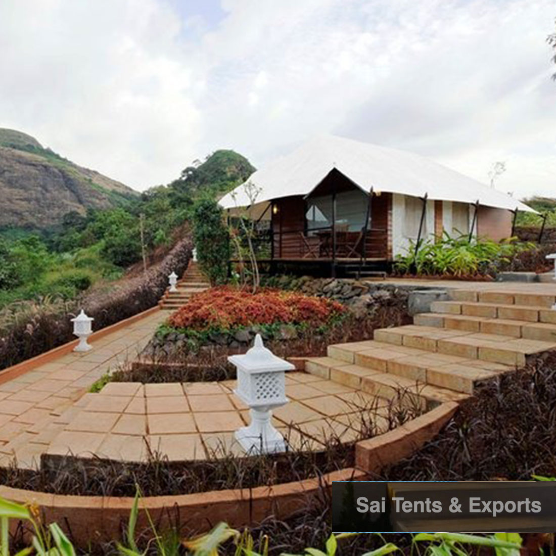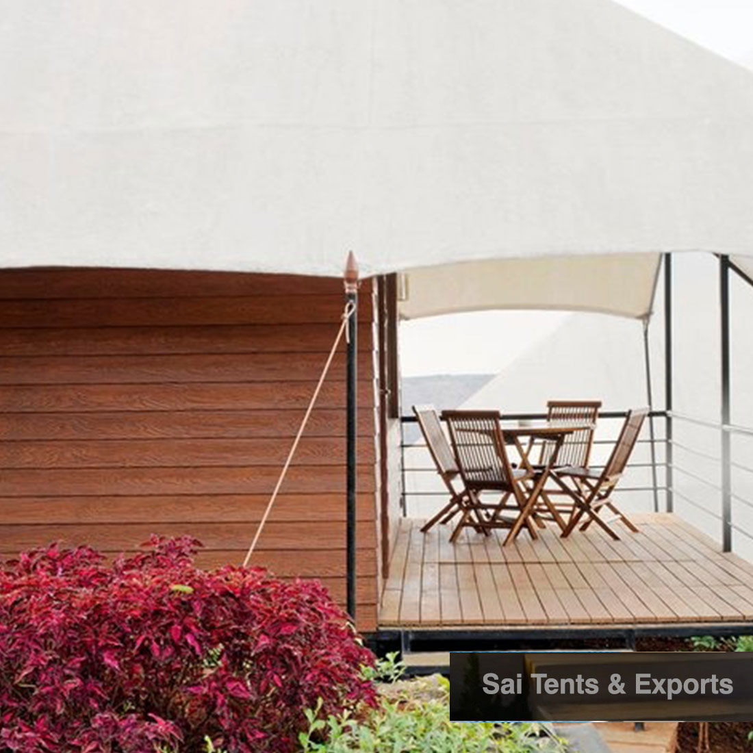 Spacious, Luxurious Swiss Cottage Tents from leading jungle safari tent manufacturers Swiss Cottage Tents available with us includes one Main Room, Attached Washroom or Dressing room, added with Open/Close verandah. Sai Tents have the most lavish collection of Square, Rectangle and round ended double fly Swiss Cottage tents provided at very superb prices. Each item available with us is placed over Steel frame or Bamboo Poles. According to the major customer’s requirements, customized sizes and colors, cottages and tents are made available to the user added in a suitable combination and quality to give it an extravagant look.