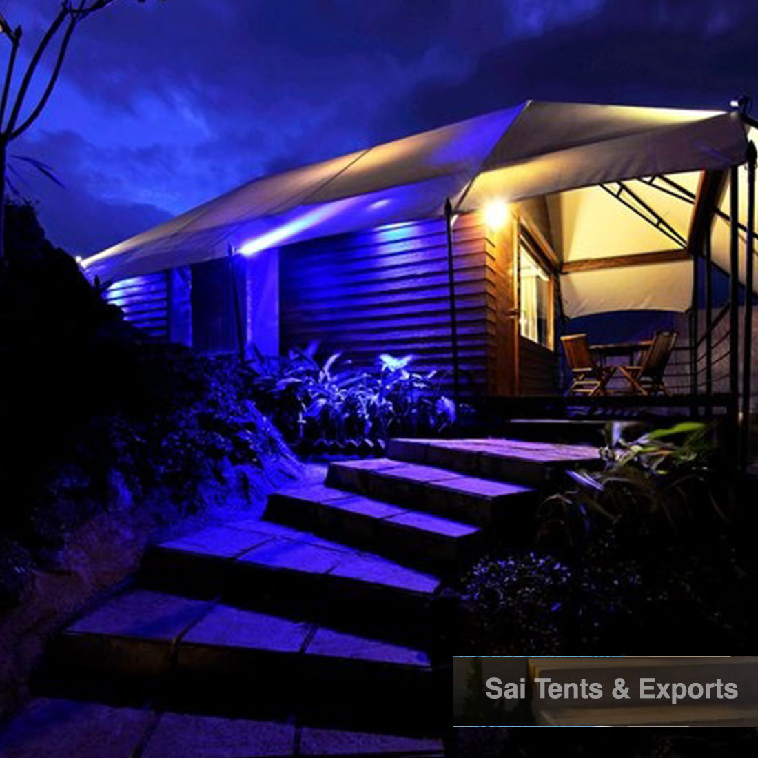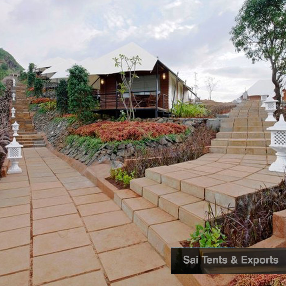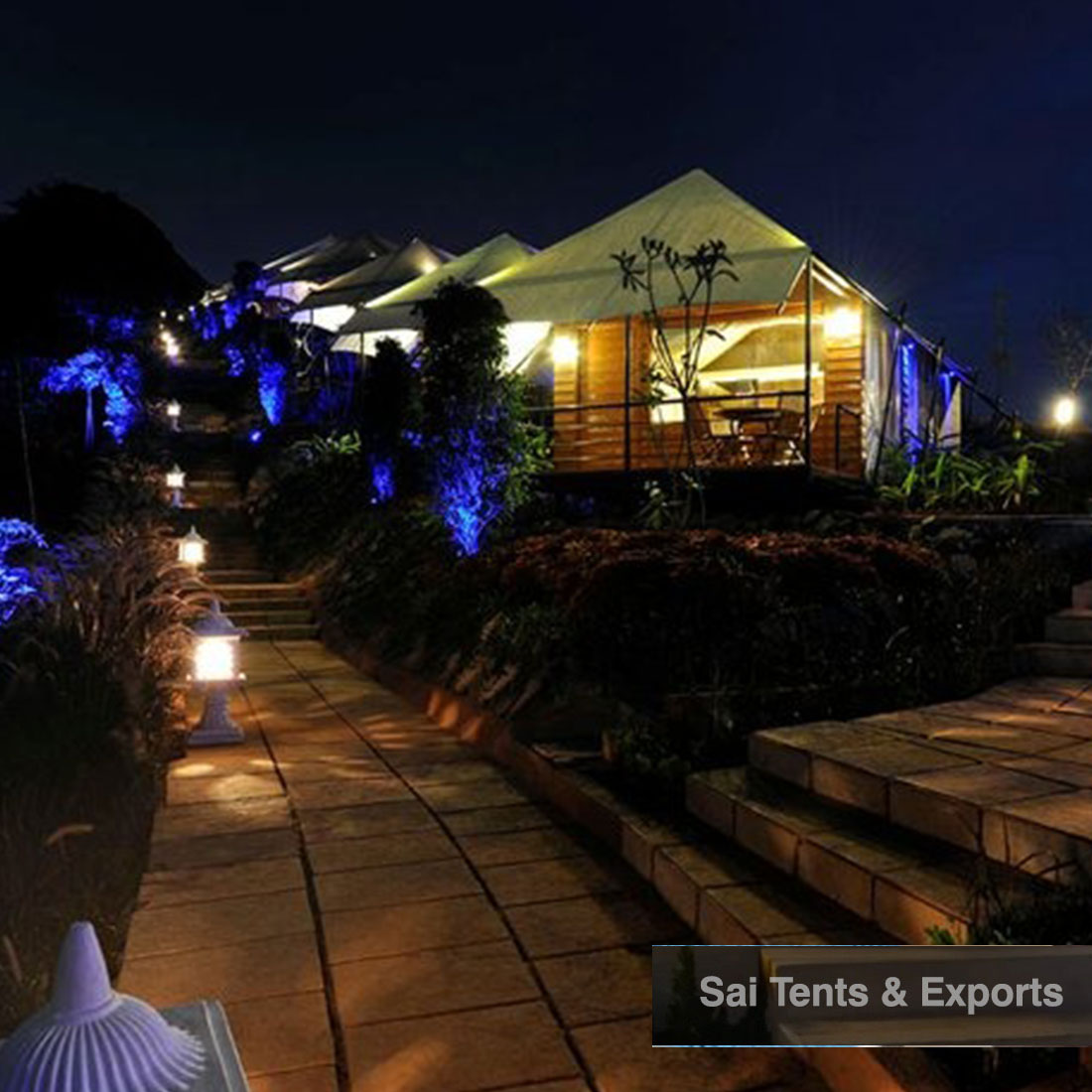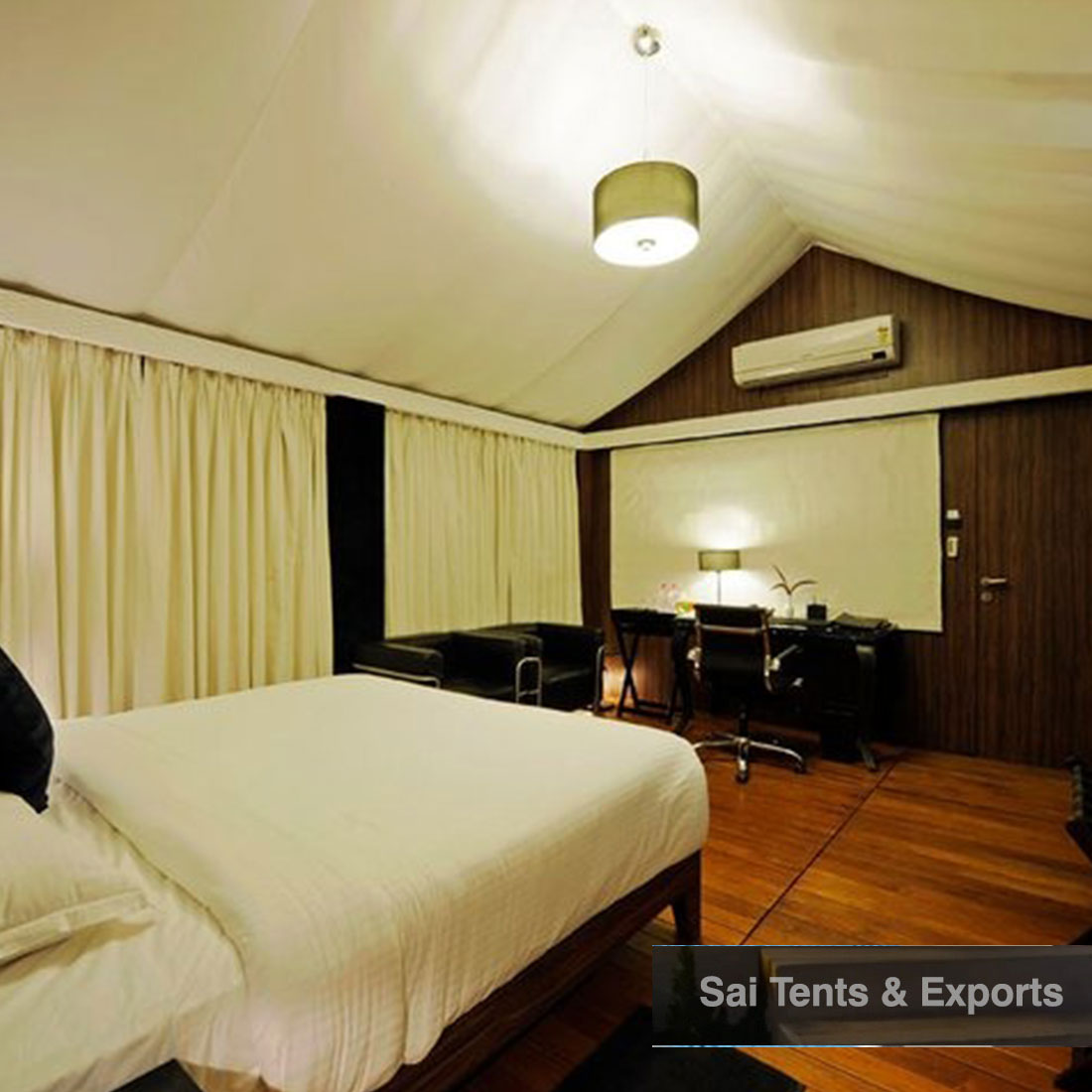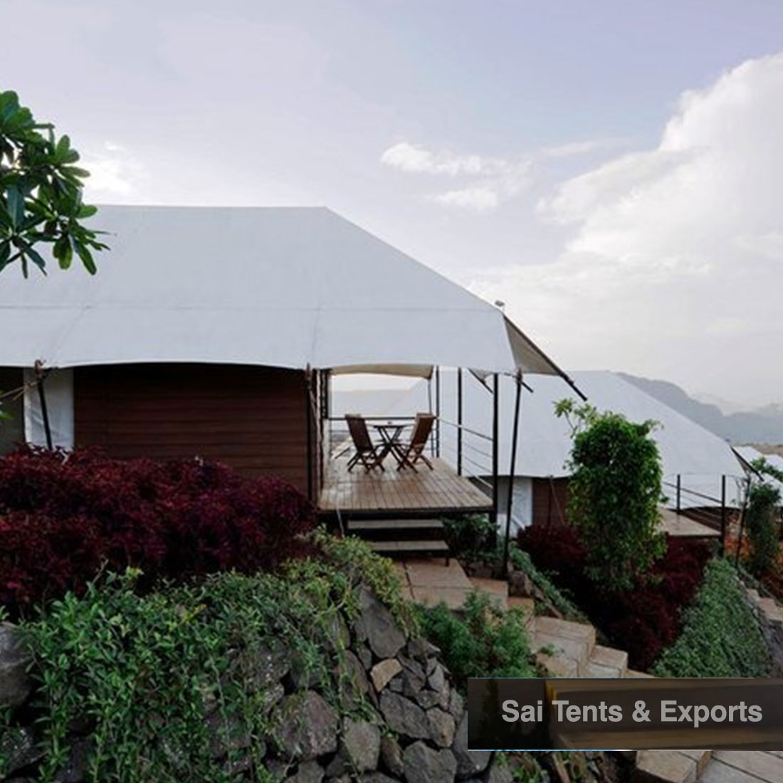 Spacious, Luxurious Swiss Cottage Tents from leading jungle safari tent manufacturers Swiss Cottage Tents available with us includes one Main Room, Attached Washroom or Dressing room, added with Open/Close verandah. Sai Tents have the most lavish collection of Square, Rectangle and round ended double fly Swiss Cottage tents provided at very superb prices. Each item available with us is placed over Steel frame or Bamboo Poles. According to the major customer’s requirements, customized sizes and colors, cottages and tents are made available to the user added in a suitable combination and quality to give it an extravagant look.