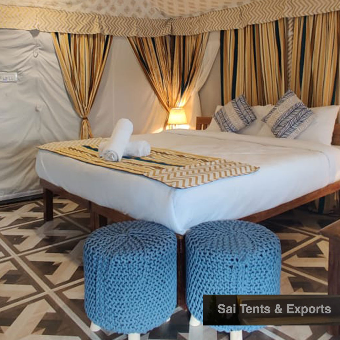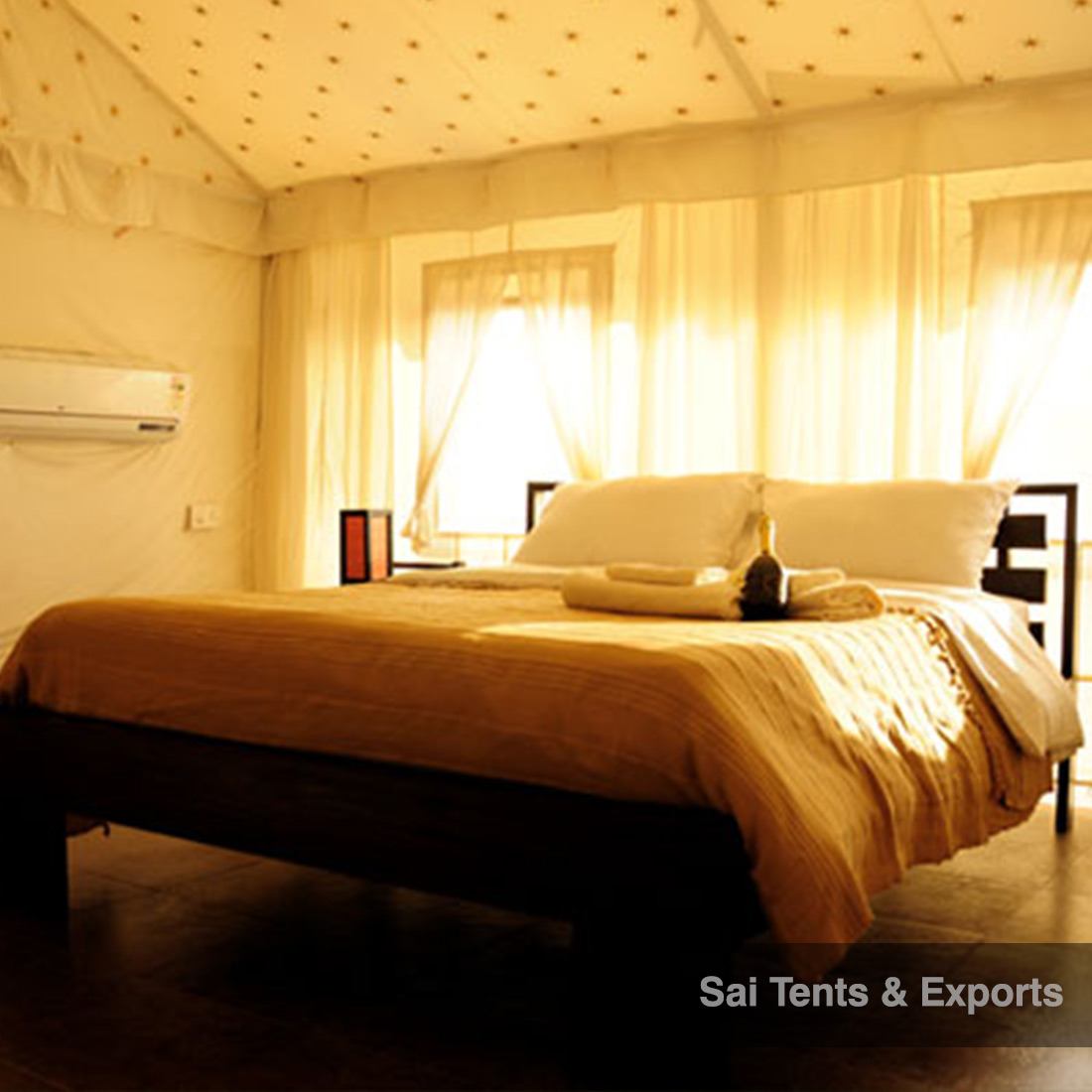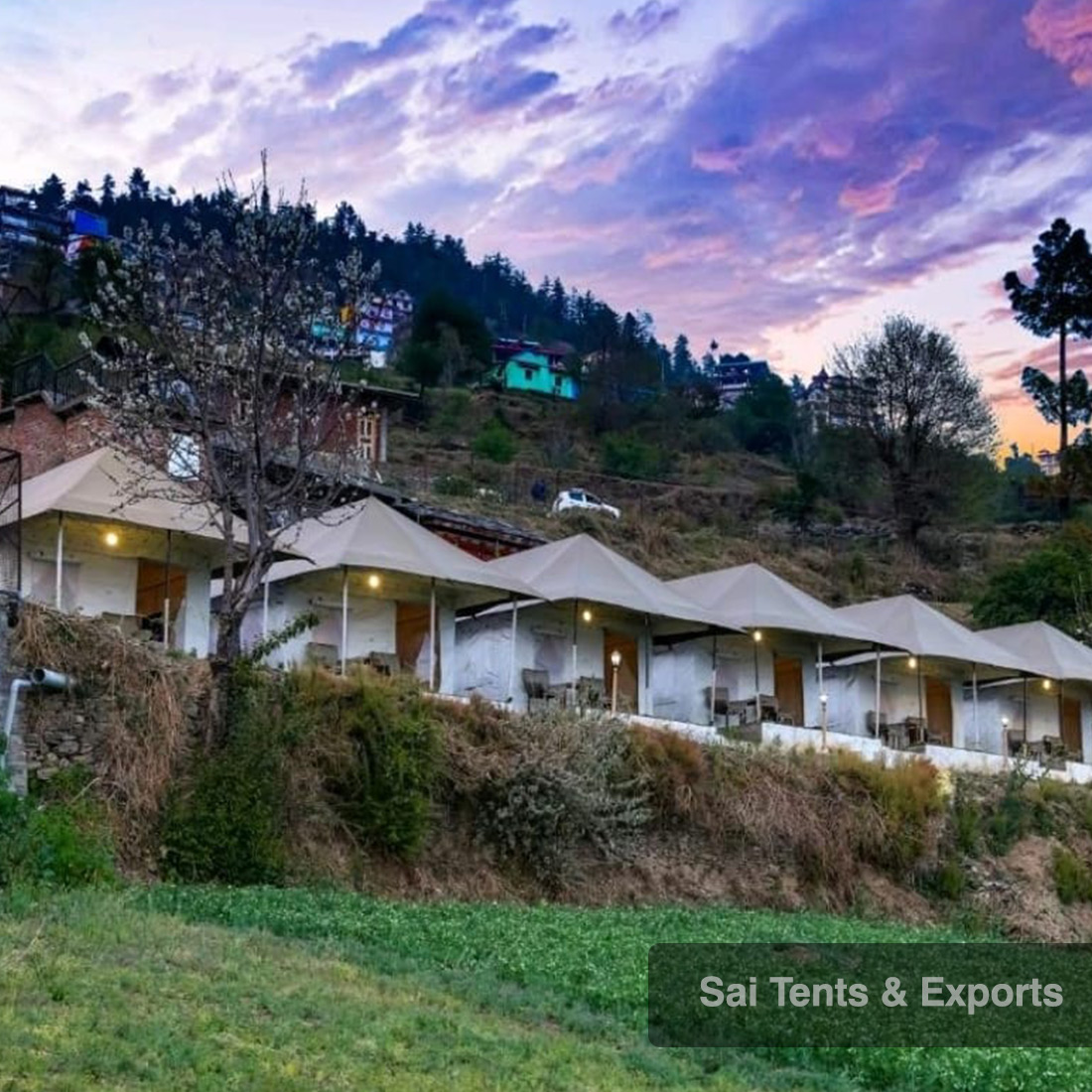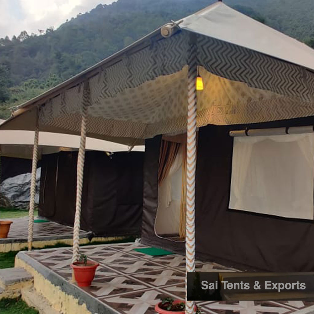 Spacious, Luxurious Swiss Cottage Tents from leading jungle safari tent manufacturers Swiss Cottage Tents available with us includes one Main Room, Attached Washroom or Dressing room, added with Open/Close verandah. Sai Tents have the most lavish collection of Square, Rectangle and round ended double fly Swiss Cottage tents provided at very superb prices. Each item available with us is placed over Steel frame or Bamboo Poles. According to the major customer’s requirements, customized sizes and colors, cottages and tents are made available to the user added in a suitable combination and quality to give it an extravagant look.